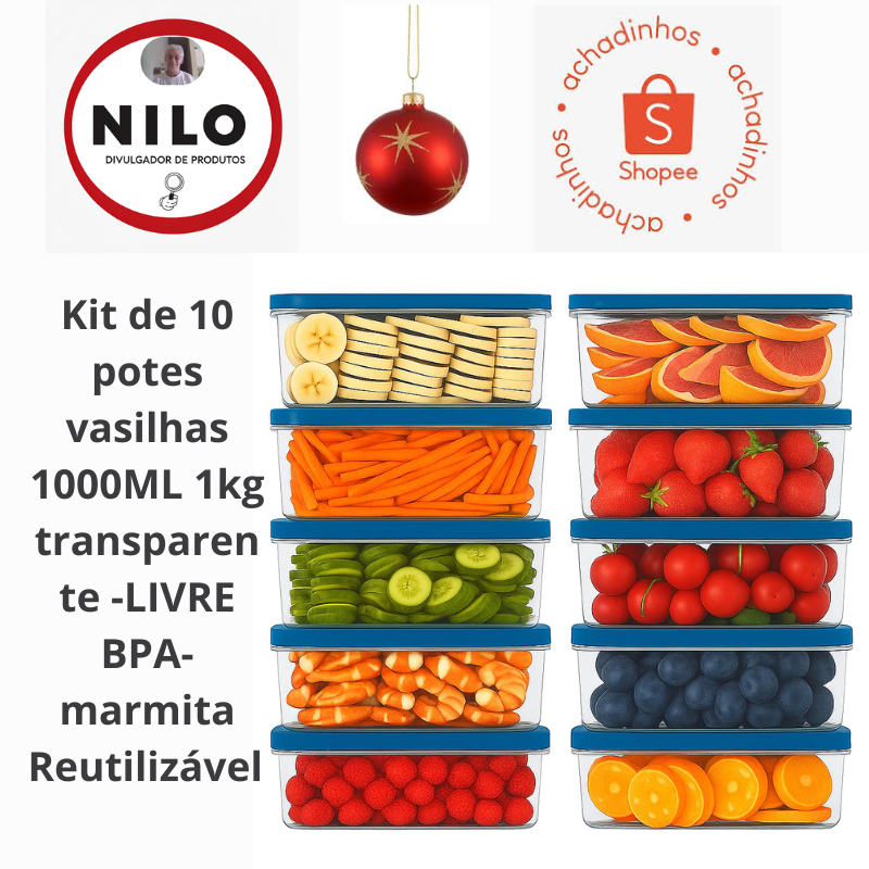 Kit de 10 potes vasilhas 1000ML 1kg transparente -LIVRE BPA- marmita Reutilizável