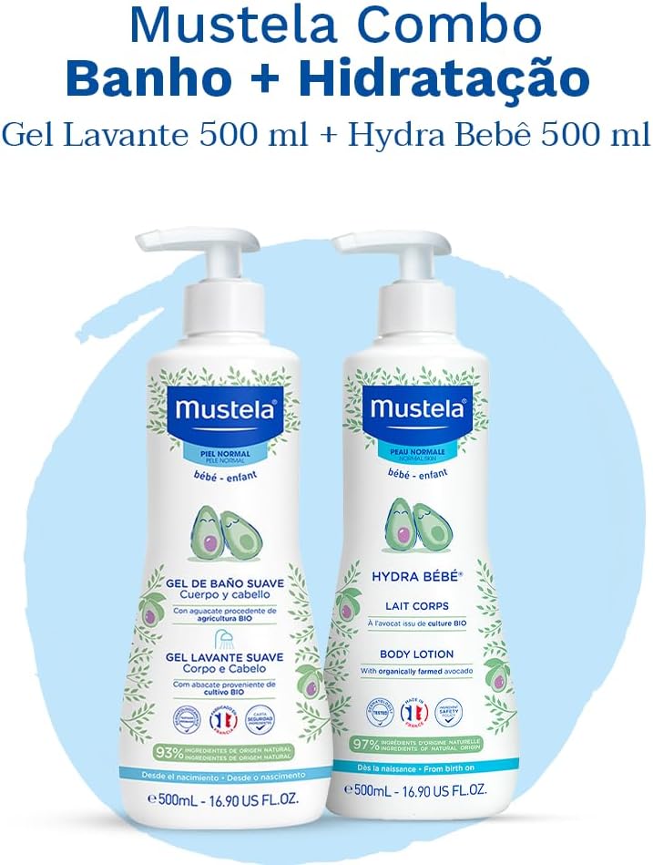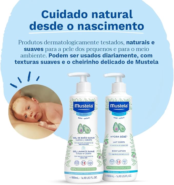 • Gel Lavante que pode ser usado desde o nascimento: feito com abacate de cultivo orgânico, protegido e respeitando a pele dos pequenos a cada uso. De alta tolerabilidade, compensa o ressecamento causado pelo banho e tem o cheirinho delicado de Mustela.