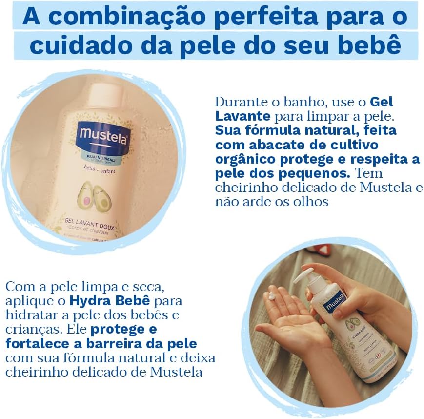 • O Gel Lavante Suave com Abacate Orgânico lava corpo e cabelo dos bebês e crianças, a loção hidratante Hydra Bebê hidrata a pele das crianças de maneira imediata e rigorosa, juntos, fazem a combinação perfeita para o cuidado da pele do seu bebê.