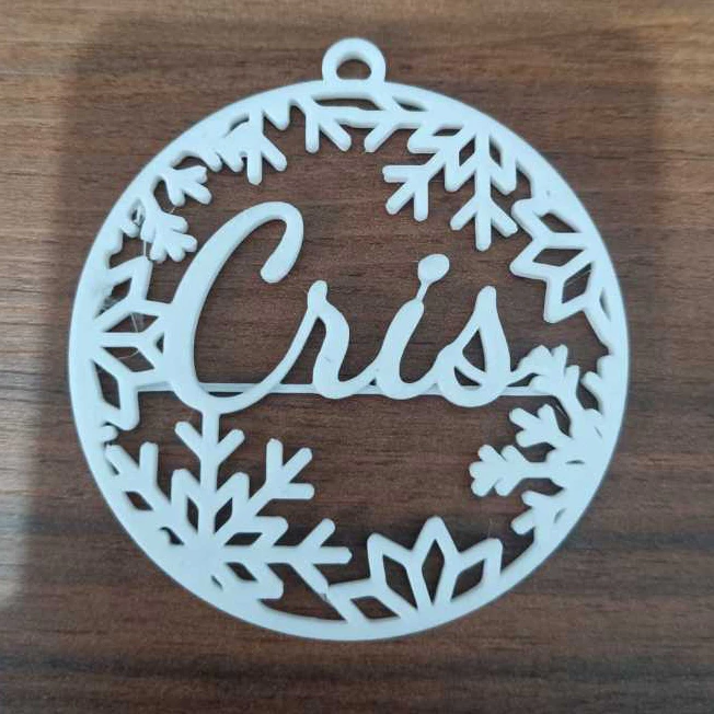 ✔️ Enfeite Circular com Nome – modelo delicado com detalhes de flocos de neve.
