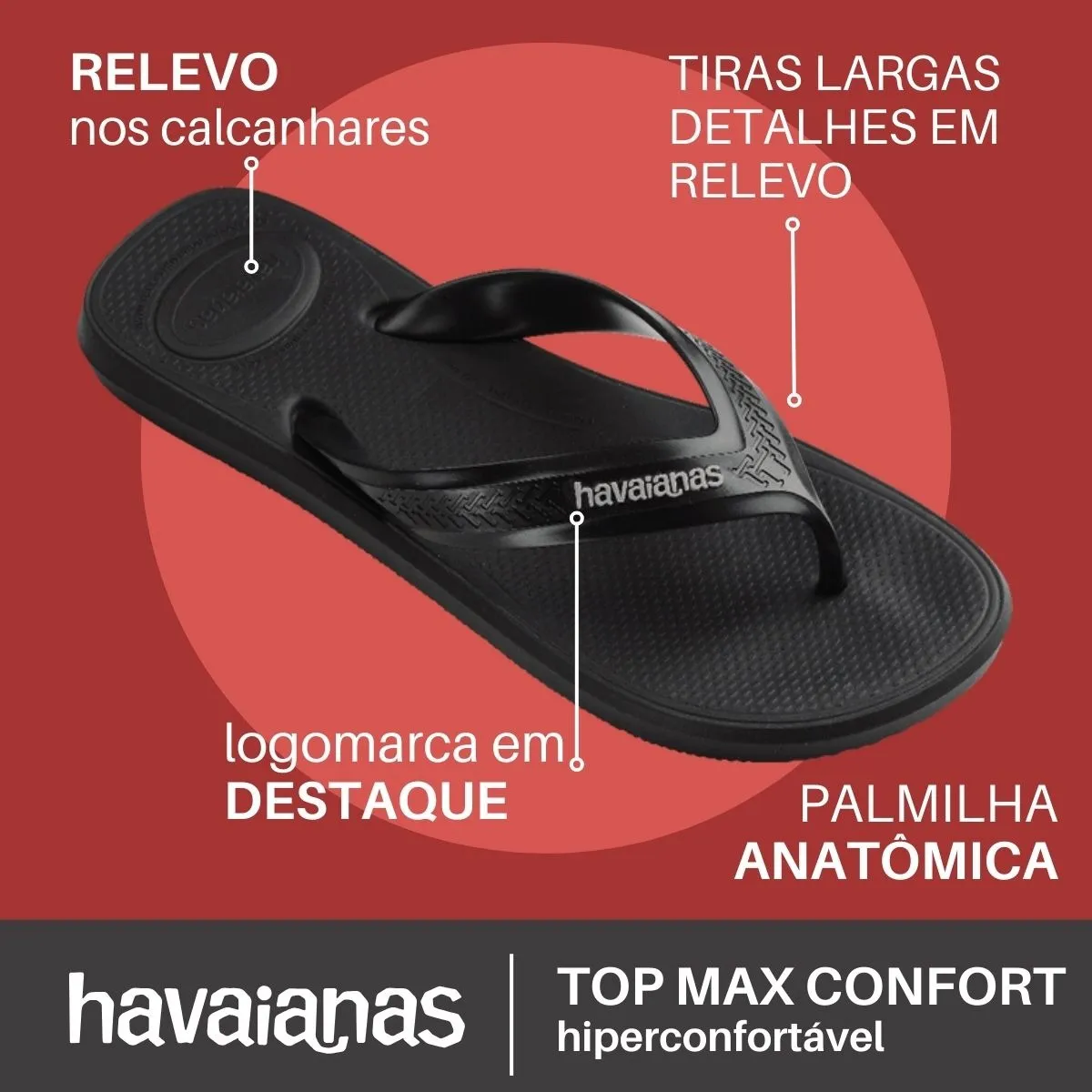 - Conforto Absoluto: Fabricado com material macio e flexível, o chinelo masculino Havaianas Top Max Confort oferece um ajuste perfeito aos seus pés, proporcionando uma sensação de leveza e bem-estar a cada passo.