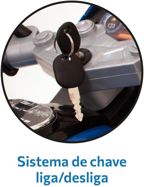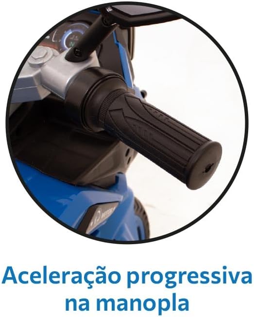 - Moto elétrica infantil na cor azul, com farol dianteiro, assento anatômico e limitador de giro do guidão para maior segurança