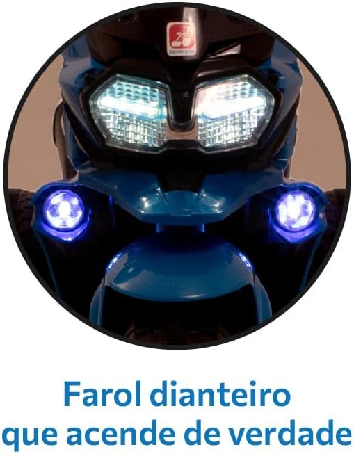 Moto Adventure (Azul) Elétrica 12V Bandeirante- Assento anatômico Leitor; indicador de bateria; Câmbio com duas marchas: frente e ré ; Movida por bateria recarregável 12V / 220V ; Dispositivo de proteção do sistema elétrico; Acompanha carregador automático 127/220V; Chave liga e desliga; Farol dianteiro; Limitador de giro do guidão; Botão frente/ré ; Entrada USB; Conexão Bluetooth; Seletor de música e indicador de bateria; Aceleração progressiva na manopla.