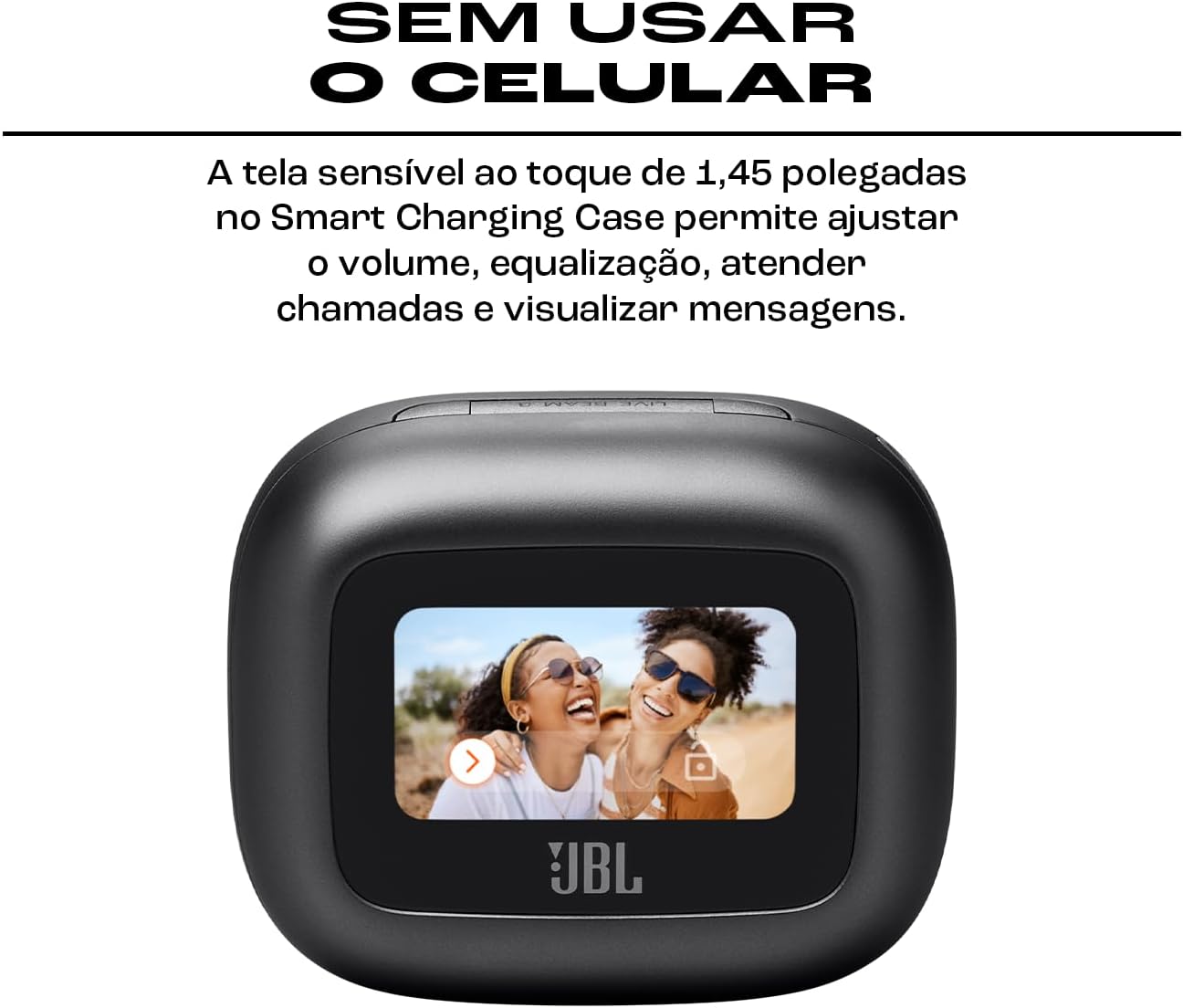 • CONTROLE TOTAL. A tela sensível ao toque de 1.45 polegadas no Smart Charging Case permite ajustar volume, equalização, atender chamadas e visualizar mensagens sem precisar do smartphone.