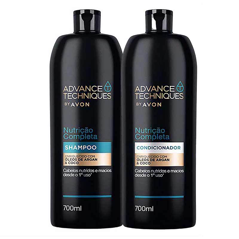 Kit Advance Techniques Nutrição Completa  700ml Shampoo + Condicionador de AVON A linha Nutrição Completa de Advance Techniques da AVON é enriquecida com óleo de Argan e infundida com Óleos de Coco, Marula e Camélia, garantindo cabelos mais sedosos, hidratados, macios e profundamente nutridos desde o primeiro uso.