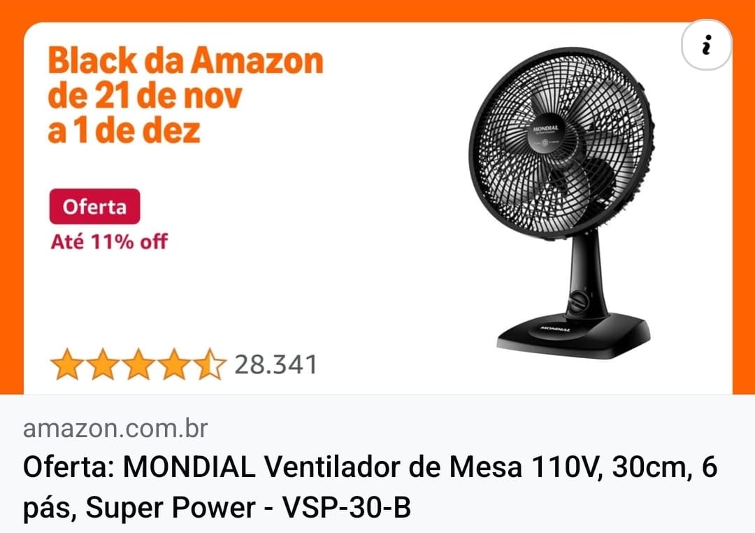 - O ventilador Super Power VSP-30-B possui 30 cm de diâmetro e hélice com 6 pás, garantindo um ambiente mais refrescante e agradável. O Sistema Oscilante Contínuo amplia o raio do vento no ambiente e a Inclinação Vertical Regulável é perfeita para o direcionamento do fluxo de ar. Saiba mais sobre o VSP-30-B:VENTO SUPER POWER: A linha de Ventiladores Super Power possui 30cm de diâmetro e 6 Pás. O design, aliado à potência, promove maior intensidade do vento e é garantia de um ambiente fresco e agradável.MAIS SILÊNCIO E CONFORTO: O sistema de ventilação da Mondial apresenta baixo nível de ruído, assegurando o silêncio necessário para momentos de concentração e uma excelente noite de sono.MAIOR DISTRIBUIÇÃO DE AR: O Sistema Oscilante Contínuo amplia o raio de alcance do vento no ambiente, permitindo uma distribuição de ar mais eficiente nos cômodos da casa.INCLINAÇÃO VERTICAL REGULÁVEL: Para um direcionamento ideal do fluxo do ar.CONTROLE DE VELOCIDADE: As 3 opções de velocidade permitem adequar o vento à sua necessidade: Máxima Turbo, Média Conforto e Mínima Silencioso.FACILIDADE NA LIMPEZA: A grade frontal removível oferece mais facilidade na limpeza das hélices, o que simplifica a lavagem e a remoção de poeira, e garante melhor qualidade do ar.ALÇA DE TRANSPORTE + PORTA-FIO: Além do design compacto, a alça traseira permite que o ventilador seja transportado entre os cômodos da casa com facilidade. Com o porta-fio embutido, você armazena o fio elétrico dentro do aparelho após o uso.UM ANO DE GARANTIA MONDIAL: A Mondial é a escolha de milhões de consumidores. Mondial, a escolha inteligente!